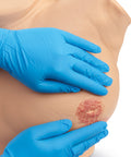 Breast cancer is the second leading cause of cancer death among women; a properly performed manual examination is an important way of detecting cancer at an early, more treatable, stage. The Advanced Breast Exam Simulator offers unparalleled realism for teaching both clinical and self-breast examination. Unlike other simulators, tissue density actually varies within the simulated breast, just as it does in a live patient. Tumors of varying sizes (1-4 cm diameter), shapes (round, oval, irregular/stellate), and densities can be inserted by the instructor for an expanded combination of training scenarios. Tumors represent adenomas, cysts, malignant tumors, and enlarged lymph nodes. The torso is correctly positioned in the supine position and allows access to both axillae. The trainer features palpable ribs, sternum and clavicles, and enlarged lymph nodes in the axillary and subclavicular areas. Peau d‘orange ("orange peel skin") with inflammation, inverted nipple, skin dimpling, and asymmetry are also depicted on the incredibly realistic skin. The Advanced Breast Exam Simulator has been designed for supine examination, but may also be used standing upright if desired. Training may also be done without the overlay skin. Includes a rigid underbody, right and left breast inserts, overlay skin, three tumor sets (27 lumps), nine soft lumps to represent soft breast tissue, one hard lump to represent chestwall infiltration, baby powder, hard carrying case, and instruction manual.