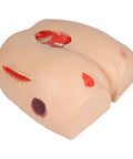 This universal pressure ulcer simulator shows stage 1, stage 2, stage 3 and stage 4 pressure ulcers. The buttocks of a geriatric patient also show a deep tissue injury, unclassifiable necrosis and a deshisced wound measuring approximately 12 cm. The life-size model is made of soft plastic and is ideal for dressing exercises, for vacuum wound therapy and for all other care measures.