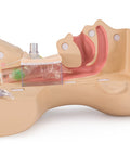 patients in the fields of nursing and caregiving when replacing cannulas or performing suction through a cannula. The model can be divided into two halves and the trachea section is transparent, allowing confirmation of the state of cannula insertion and the position of the suction catheter in the cannula during suction. In addition, with the specially provided cannula attached, a ventilator can be operated by connection a test lung (simulated lung) to the model.