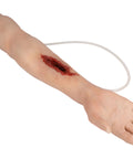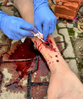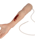 This life-size mold of a real human arm is made of skin-like material and is movable. It has a deep laceration on the forearm with a bleeding system that can bleed with optional bleeding devices. The application of a tourniquet is possible, if applied correctly the bleeding stops. This model is also ideal for practicing wound packing.