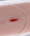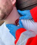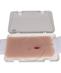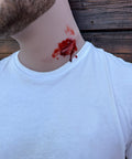 This moulage is made of silicone and shows a stab wound on the neck. The moulage is designed as a collar and can be additionally secured in the neck with a Velcro fastener. The moulage is self-adhesive to dolls or human skin. The moulage has a supply line with a connection for the bleeding system. It can also be applied with moulage adhesive, but the moulage will permanently lose its self-adhesive properties if the adhesive is used. All wounds are packed in plastic boxes to ensure safe storage.